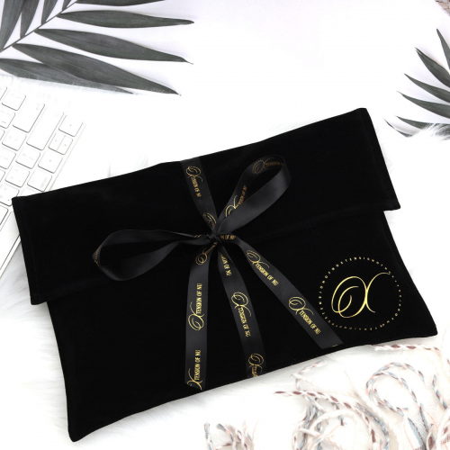 Custom black velvet Envelope bag for wig hair with gold logo and ribbon tie
